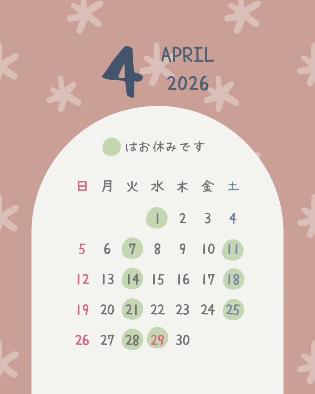 4月の営業のお知らせ。 2026/04/01 4月の営業のお知らせ。 4月のお休みは 1日(水) 4日(土) 7日(火) 11日(土) 14日(火) 18日(土) 21日(火) 25日(土) 28日(火) 29日(水) となります。 ご確認の上ご予約いただきますよう、よろしくお願いいたします。 セルフホワイトニング 産後骨盤矯正